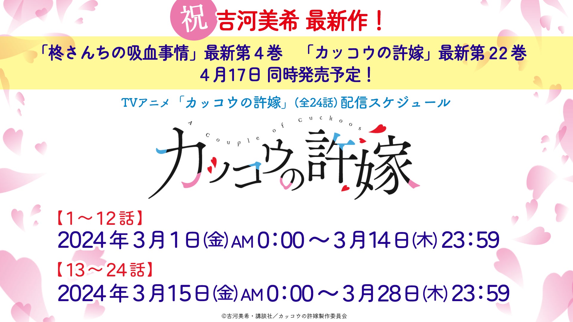 記念として、YouTubeチャンネル「フル☆アニメTV」でTVアニメ「カッコウの許嫁」全24話が無料配信されます。