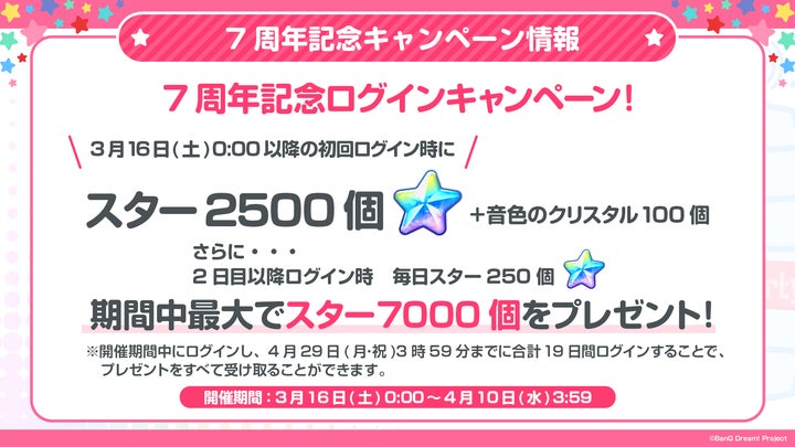 2. 7周年記念ログインキャンペーンが開催中!最大7000個のスターと100個の音色のクリスタルがもらえます。