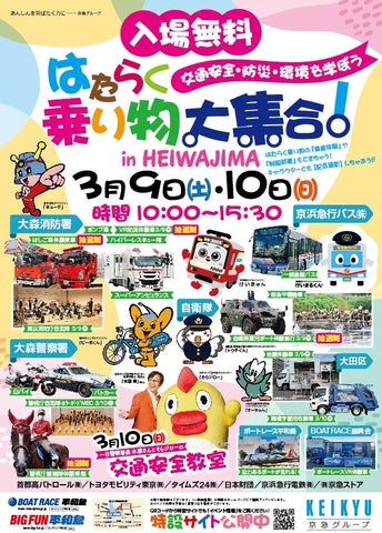 2024年3月9日(土)・10日(日)にBIGFUN平和島で開催される「はたらく乗り物大集合 in HEIWAJIMA」は、子供たちの好奇心を刺激し、交通安全や防災意識、環境対策を学ぶイベントです。