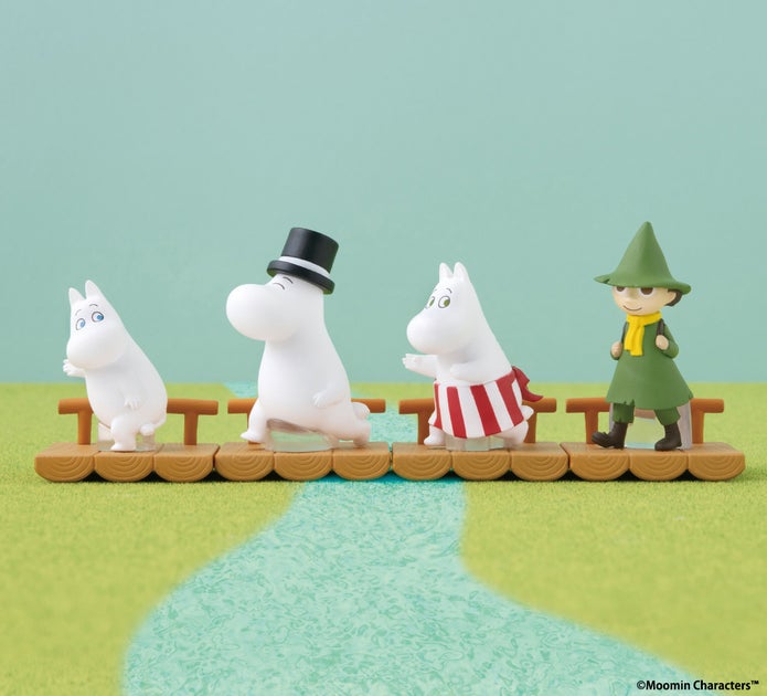 2024年3月第2週から発売される「MOOMIN みんなでおでかけフィギュア」は、ムーミン谷の橋をイメージした台座付きのキャラクターフィギュアで、全4種類が登場します。