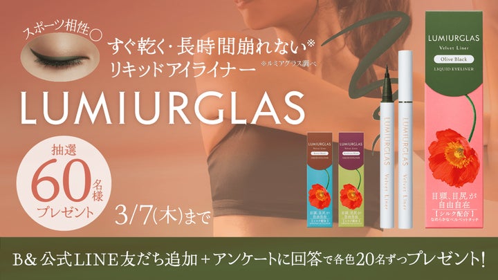 女性向けスポーツウェブメディア「B&」が、速乾性で長時間崩れない『LUMIURGLAS ベルベットライナー』のプレゼントキャンペーンを開催します。