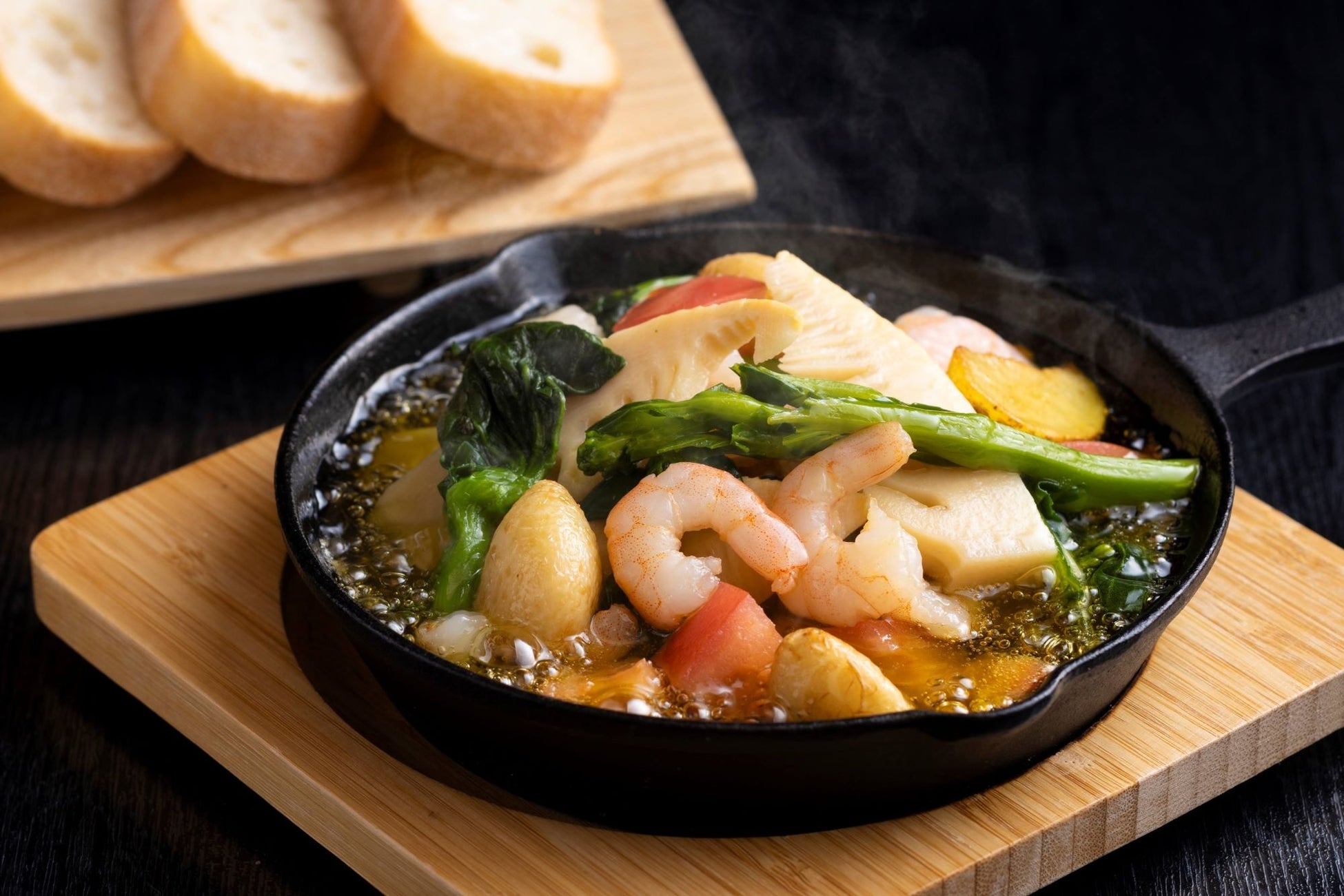 春野菜のアヒージョや自家製ローストビーフなど、多彩なメニューが楽しめます。
