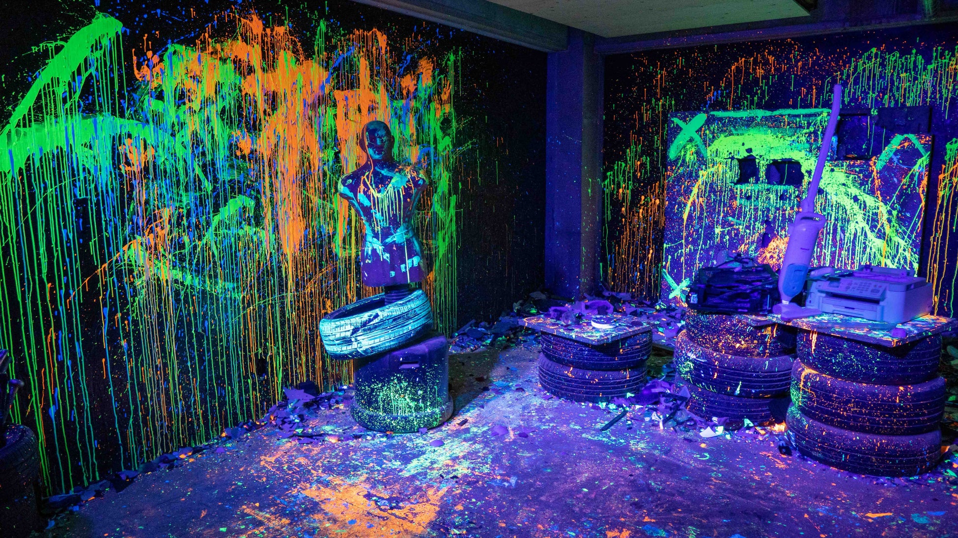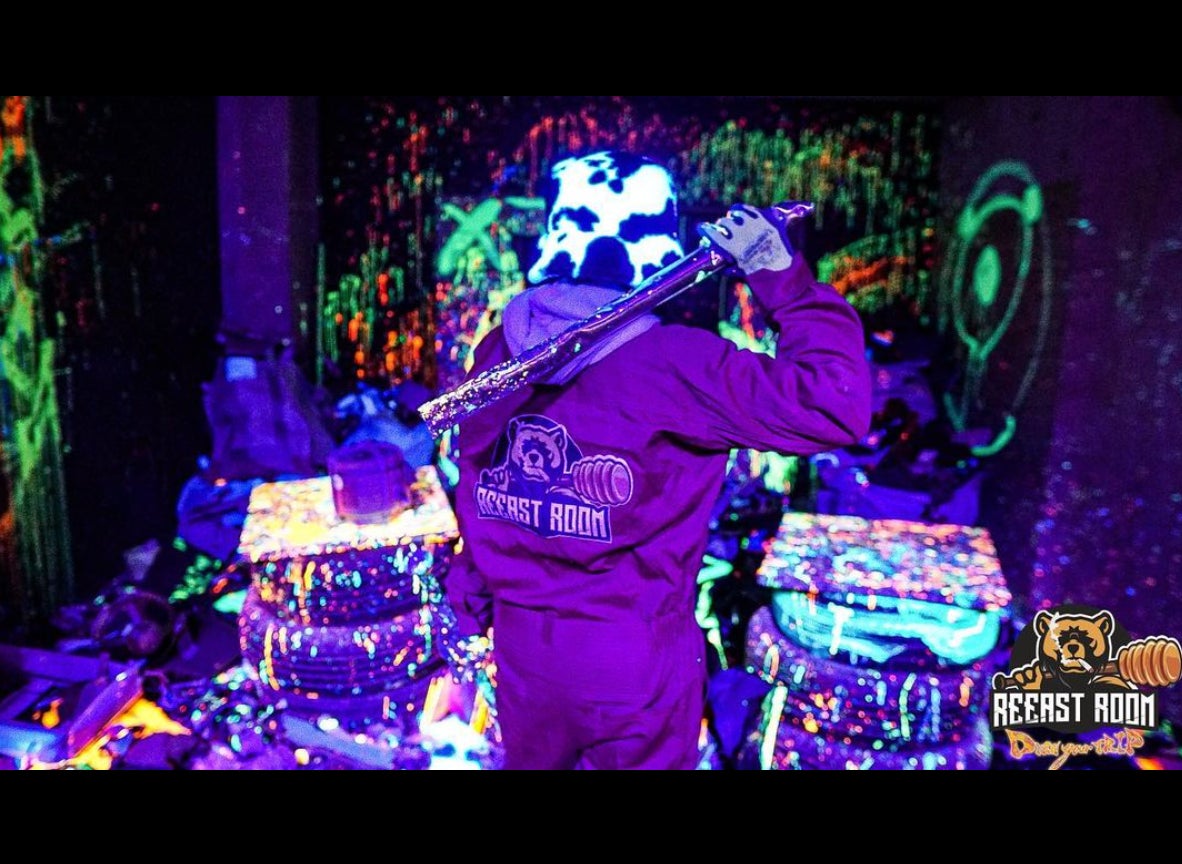 “NEON SMASH”では、暗闇の部屋の中で、ネオンカラーに光り輝く食器や小型家電を、バット等の武器を使用して思う存分壊すことができます。