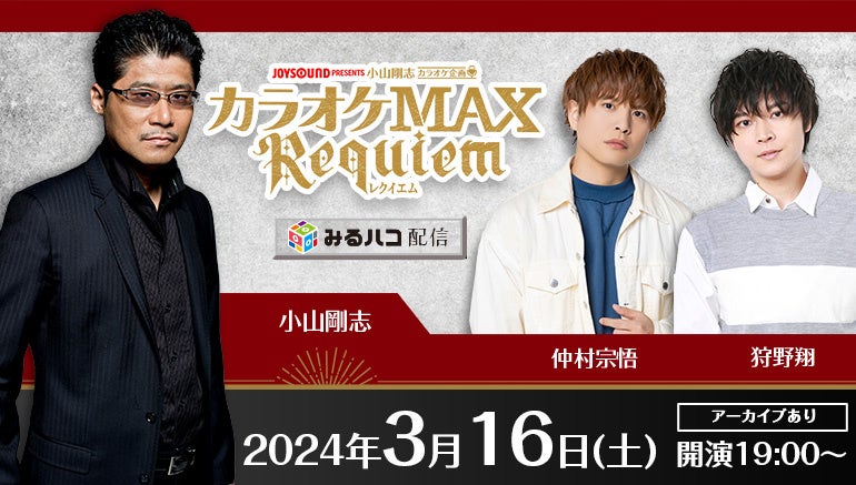 2024年3月1日から「みるハコ」WEBサイトで販売される「JOYSOUND presents 小山剛志カラオケ企画 カラオケMAX~レクイエム~」のチケットは1人2,000円で、生配信と再視聴が可能です。