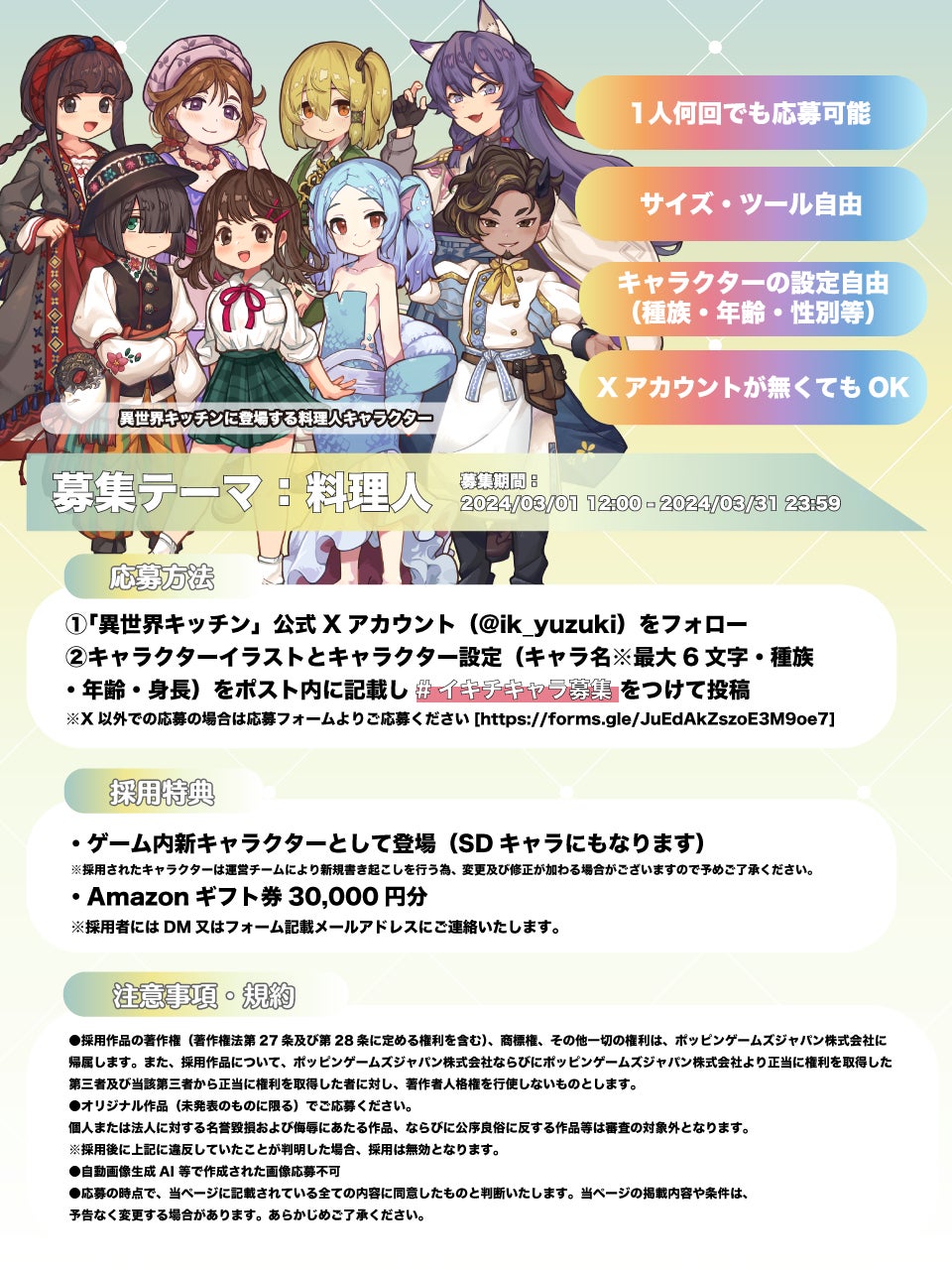 『異世界キッチン』では、料理人キャラクターを募集中です。