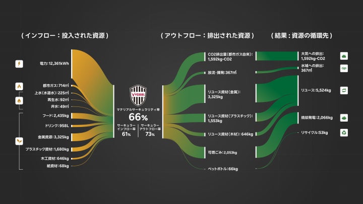 「サーキュラリティ評価」とは、企業の資源の循環性を評価する手法であり、レコテックは「ヴィッセル神戸」の資源の調達から廃棄までのプロセスを数値化しました。