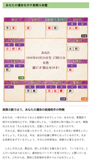 生年月日から命盤を算出し、結婚運や相手の特徴、出会いや結婚後の生活について占います。