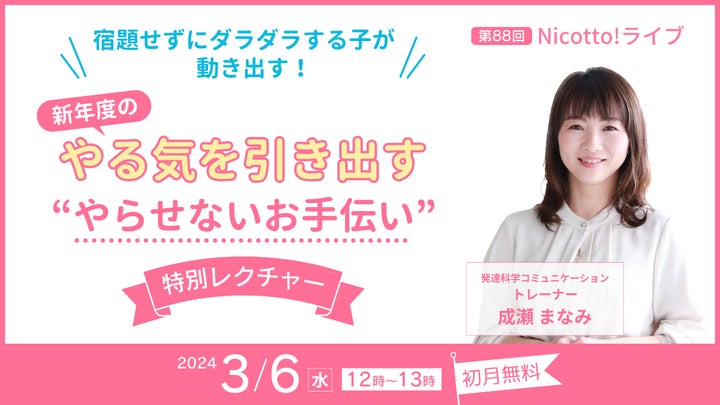 テーマは「宿題せずにダラダラする子が動き出す!新年度のやる気を引き出すやらせないお手伝い」です。