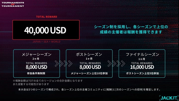 Scalably株式会社が主催する「JACK IT」プロジェクトが、eSportsコミュニティの成長をサポートするために、2024年3月1日から『TOURNAMENTS OF TOURNAMENT』(TOT)の日本大会を開催します。