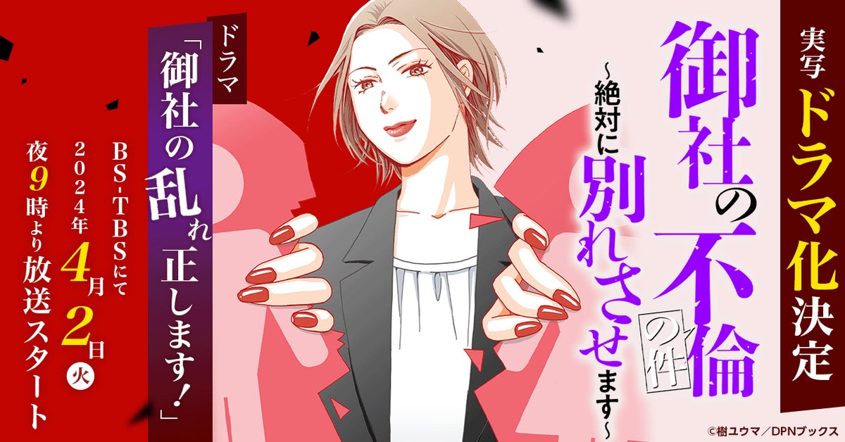 DPNブックスの人気作品『御社の不倫の件~絶対に別れさせます~』が、山崎紘菜さん、飯島寛騎さん、小笠原海さんによって実写ドラマ化され、BS-TBSで4月2日(火)夜9:00から放送されます。