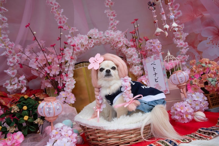ペットオーナーたちが集まり、愛犬がお内裏様やお雛様になりきる撮影会が大盛況でした。