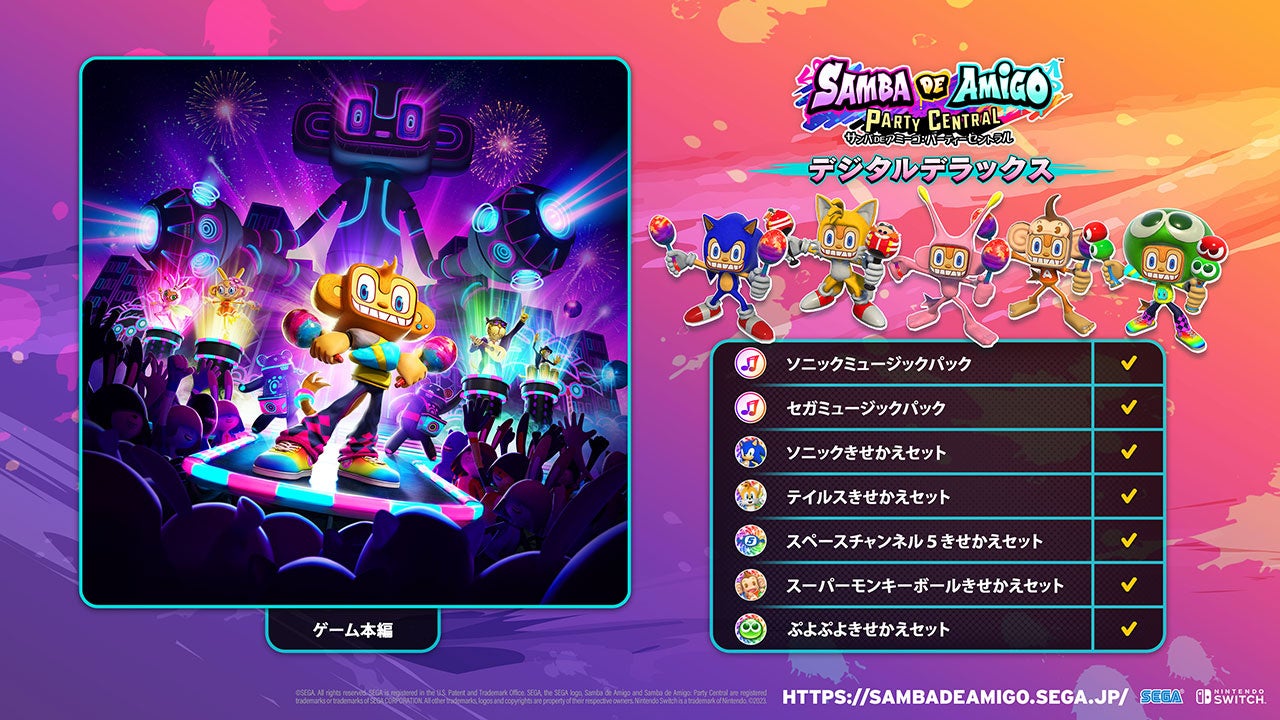 株式会社セガは、Nintendo Switch™用ソフト『サンバDEアミーゴ:パーティーセントラル』の発売日が、2023年8月30日(水)に決定したことをお知らせします。また、さまざまなダウンロードコンテンツ(DLC)がセットになったデジタルデラックス版も同時発売いたします。