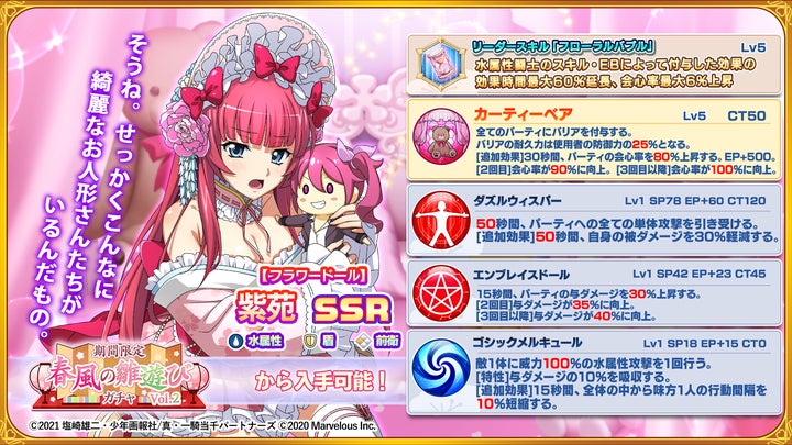 限定衣装の「【フラワードール】紫苑」(CV:金元 寿子)が登場し、排出率が高いです。