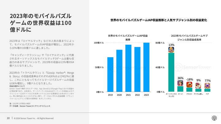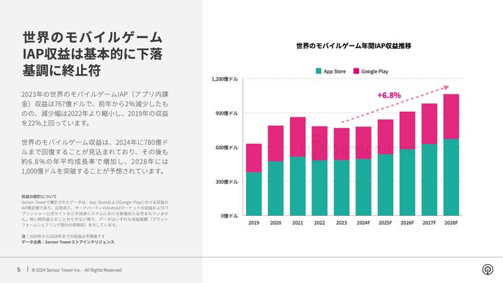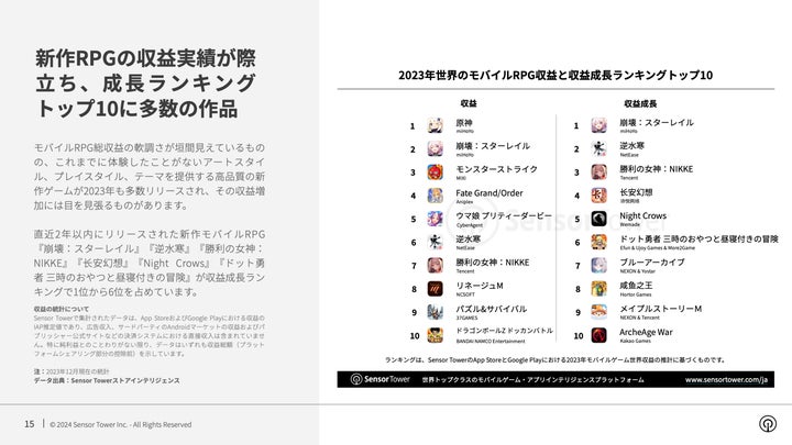 このレポートには、モバイルゲームの収益推移やジャンル別の変化、人気ゲームの分析が含まれています。
