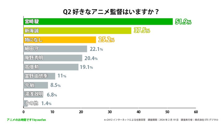 調査によると、監督を気にする人は31.6%で、その中で宮崎駿監督が最も人気で51.9%が支持しています。