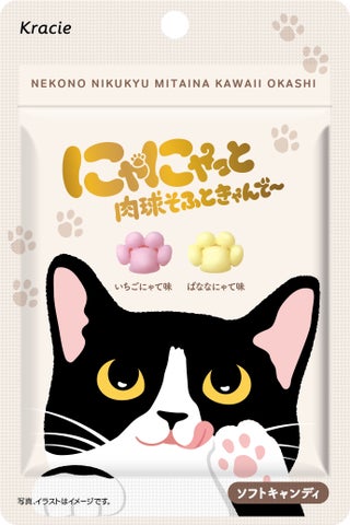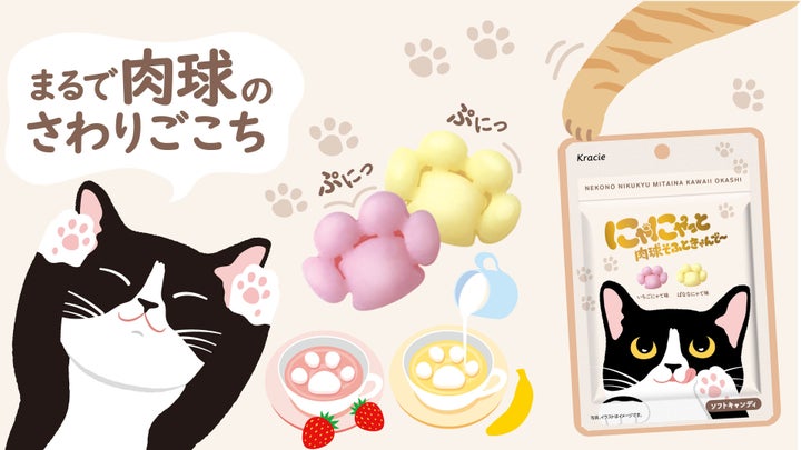 「にゃにゃっと 肉球そふときゃんで~」は、猫の肉球をイメージした可愛い形のソフトキャンディで、いちご味とバナナ味が楽しめます。