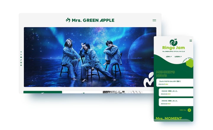 音楽アーティスト「Mrs. GREEN APPLE」のオフィシャルサイトとファンクラブ「Ringo Jam」が2024年3月3日にフルリニューアルオープンしました。