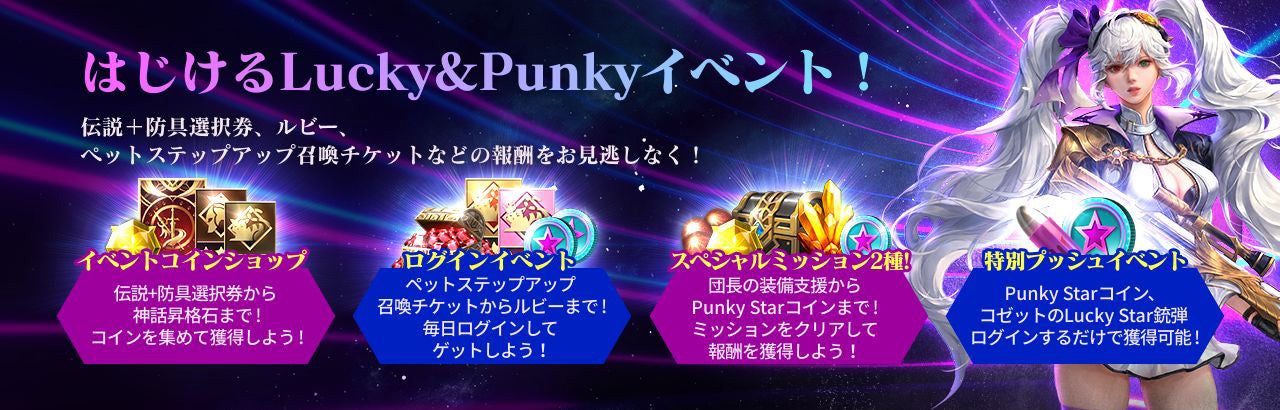 イベント期間中にゲームにログインするだけで、アイテムがもらえる「Lucky&Punky!ログインイベント」や、英雄・装備・ペットなどの合計召喚数に応じて、Punky Pet コインを獲得できる「Lucky&Punky!コルトと召喚イベント」などがある。