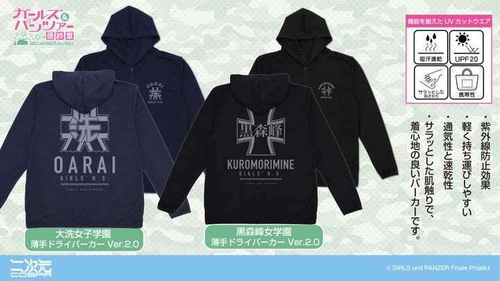戦車道Tシャツには「戦車道は乙女のたしなみ!」というメッセージが入っており、ドライパーカーは吸水速乾&紫外線防止効果も備えています。
