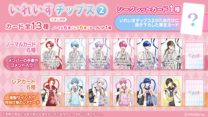 商品には全13種のオリジナルカードがランダムで1枚付属し、ノーマルカード6種、レアカード6種、シークレットカード1種が含まれます。