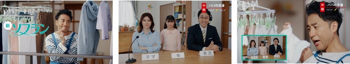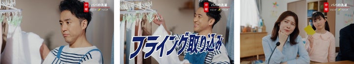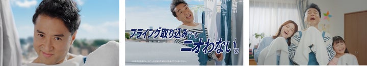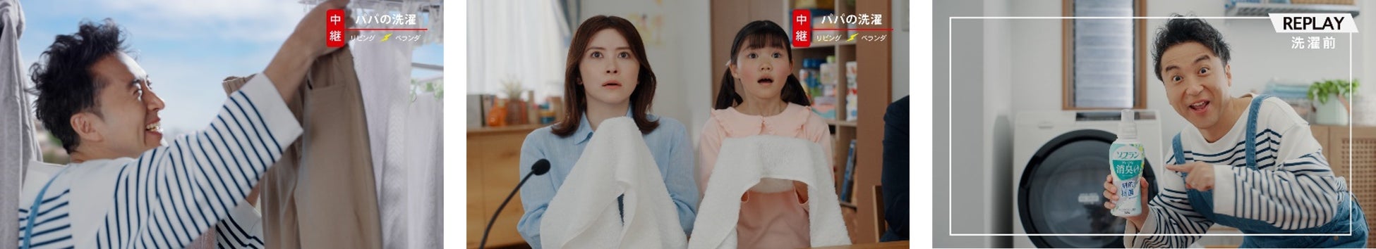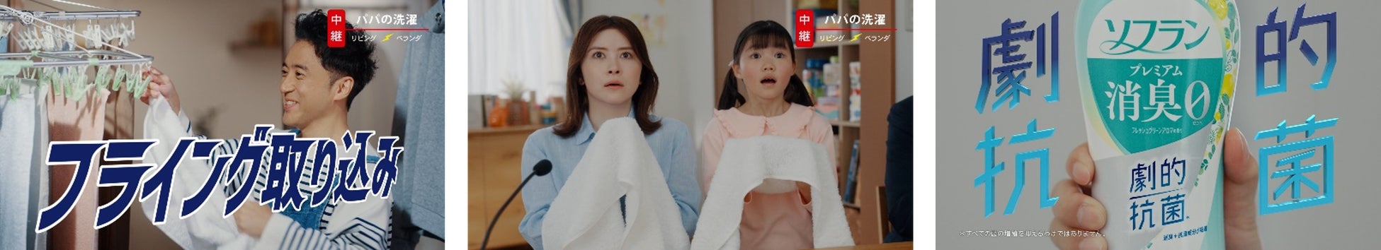 ムロツヨシさんと宮澤エマさんが共演する新TVCMでは、ムロツヨシさん演じるパパが洗濯物をフライングで取り込む様子が実況中継されます。