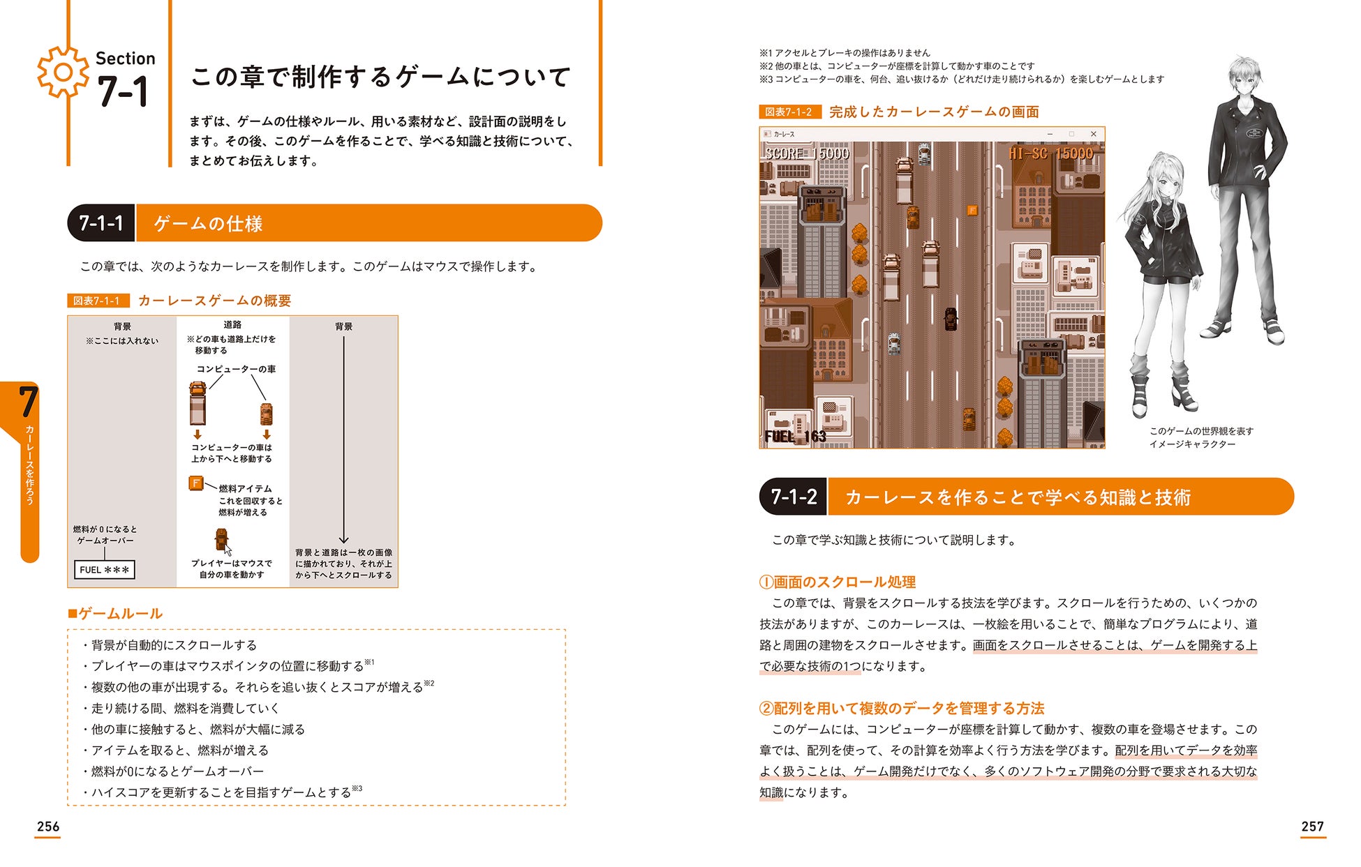 本書ではテニスやカーレース、シューティングなどの人気ジャンルを通して基礎を学びます。
