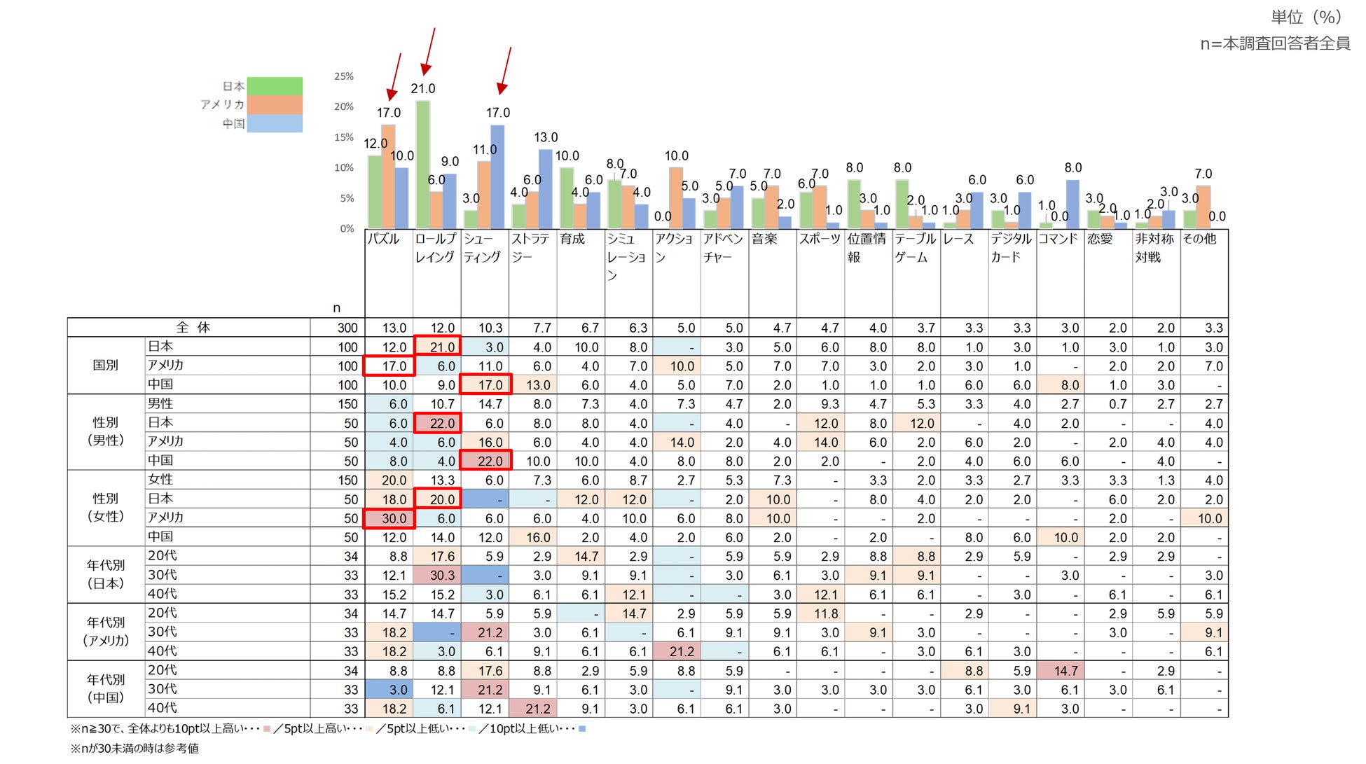 - 日本は「ロールプレイング」、アメリカは「パズル」、中国は「シューティング」が主流