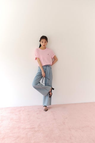 ストレッチデニムパンツは美脚効果抜群で、Tシャツとも合わせやすい。
