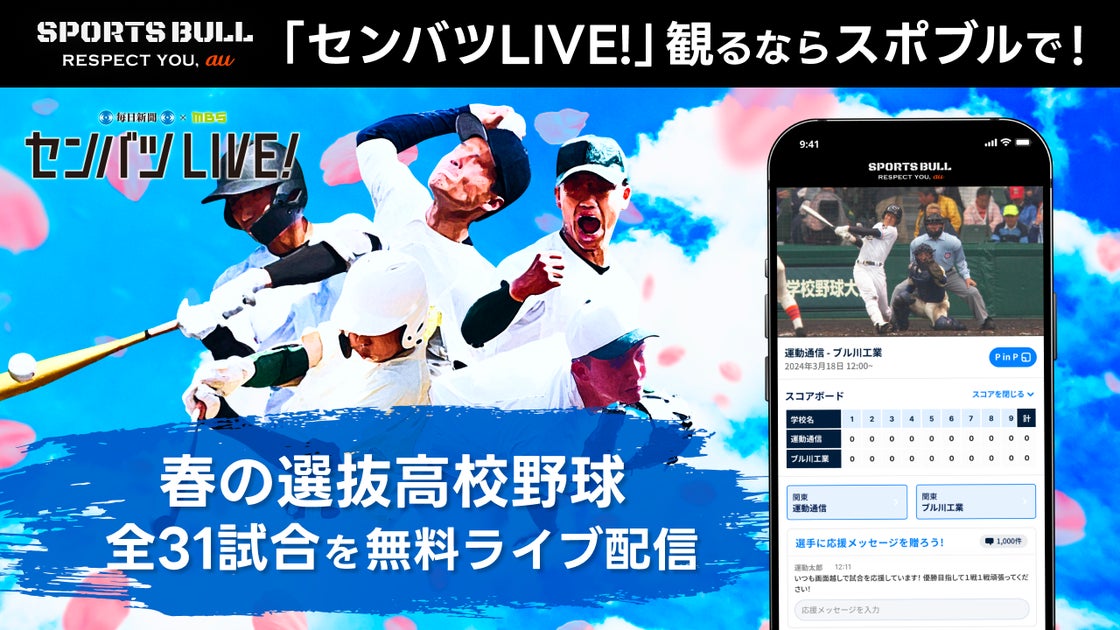 2024年3月18日に開幕する第96回選抜高等学校野球大会の全31試合が、運動通信社とKDDIが運営するスポーツメディア「SPORTS BULL」内の「センバツLIVE!」で無料ライブ配信されます。