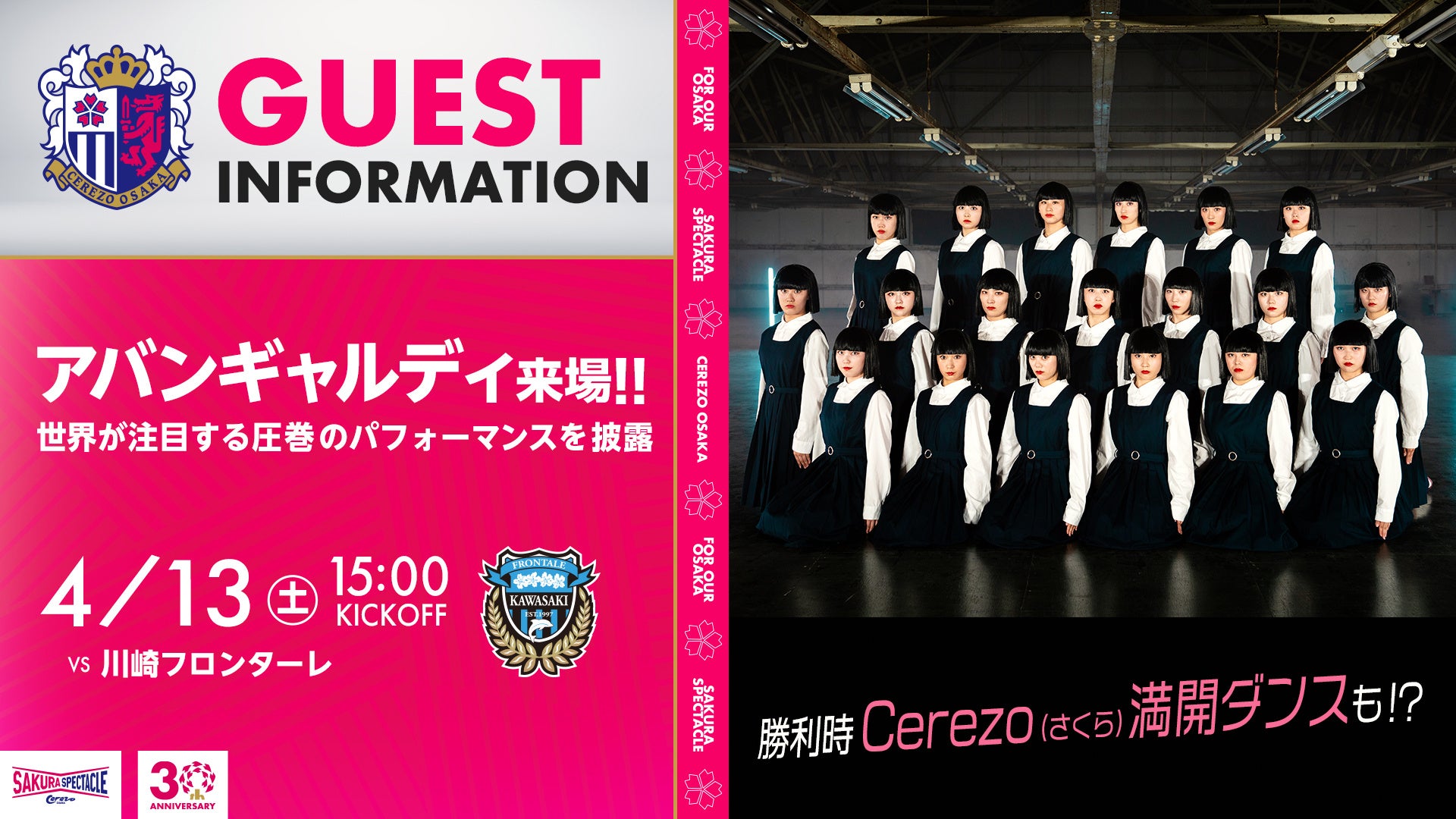 4/13(土)のセレッソ大阪対川崎フロンターレ戦では、世界的に人気のダンスグループ、アバンギャルディがハーフタイムにパフォーマンスを披露します。