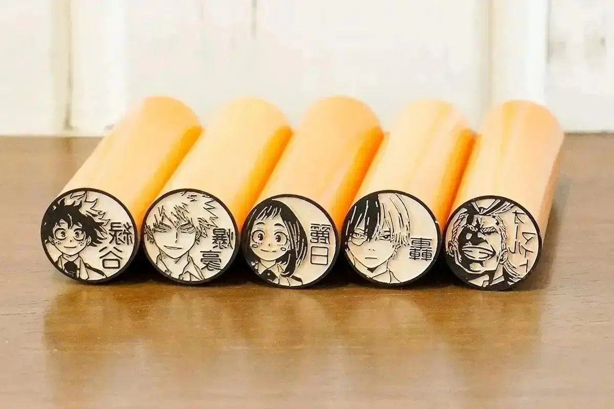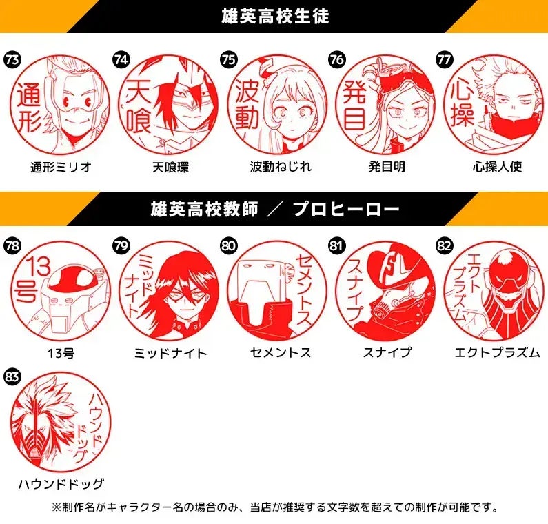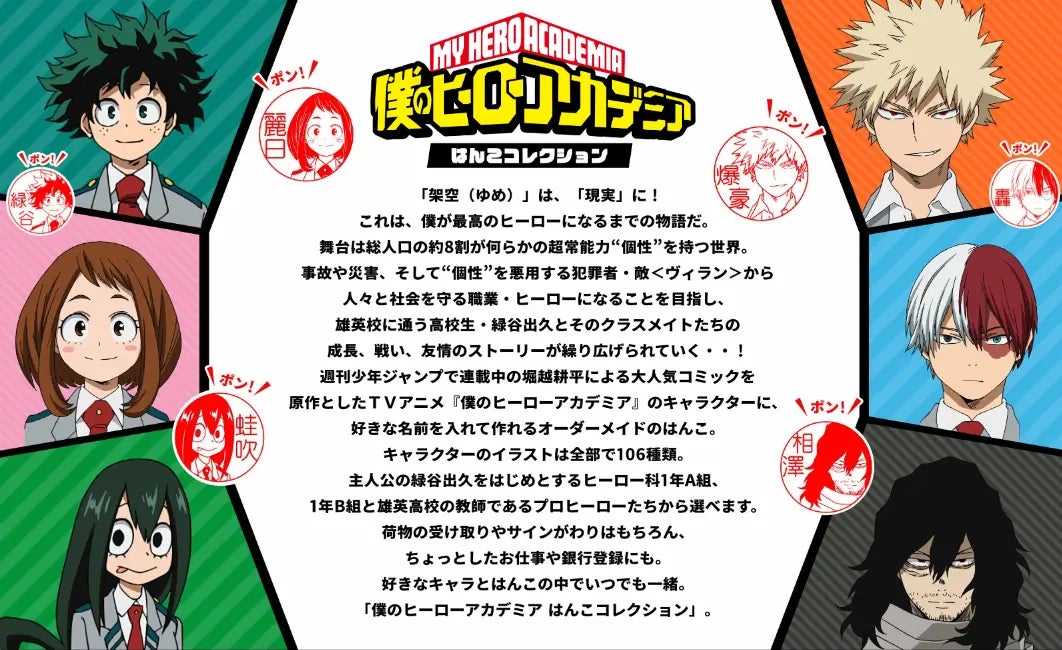 週刊少年ジャンプで連載中の人気TVアニメ「僕のヒーローアカデミア」のお気に入りのキャラクターと好きな名前や文字でつくれるオーダーメイドのはんこで、106種類のキャラクターから選ぶことができる。