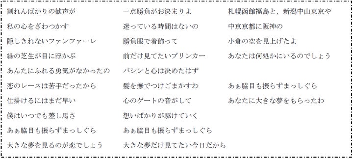 ミュージックビデオには、東京競馬場の日本庭園や競馬場のスタンドで歌う姿や馬と触れ合う姿が映し出されます。