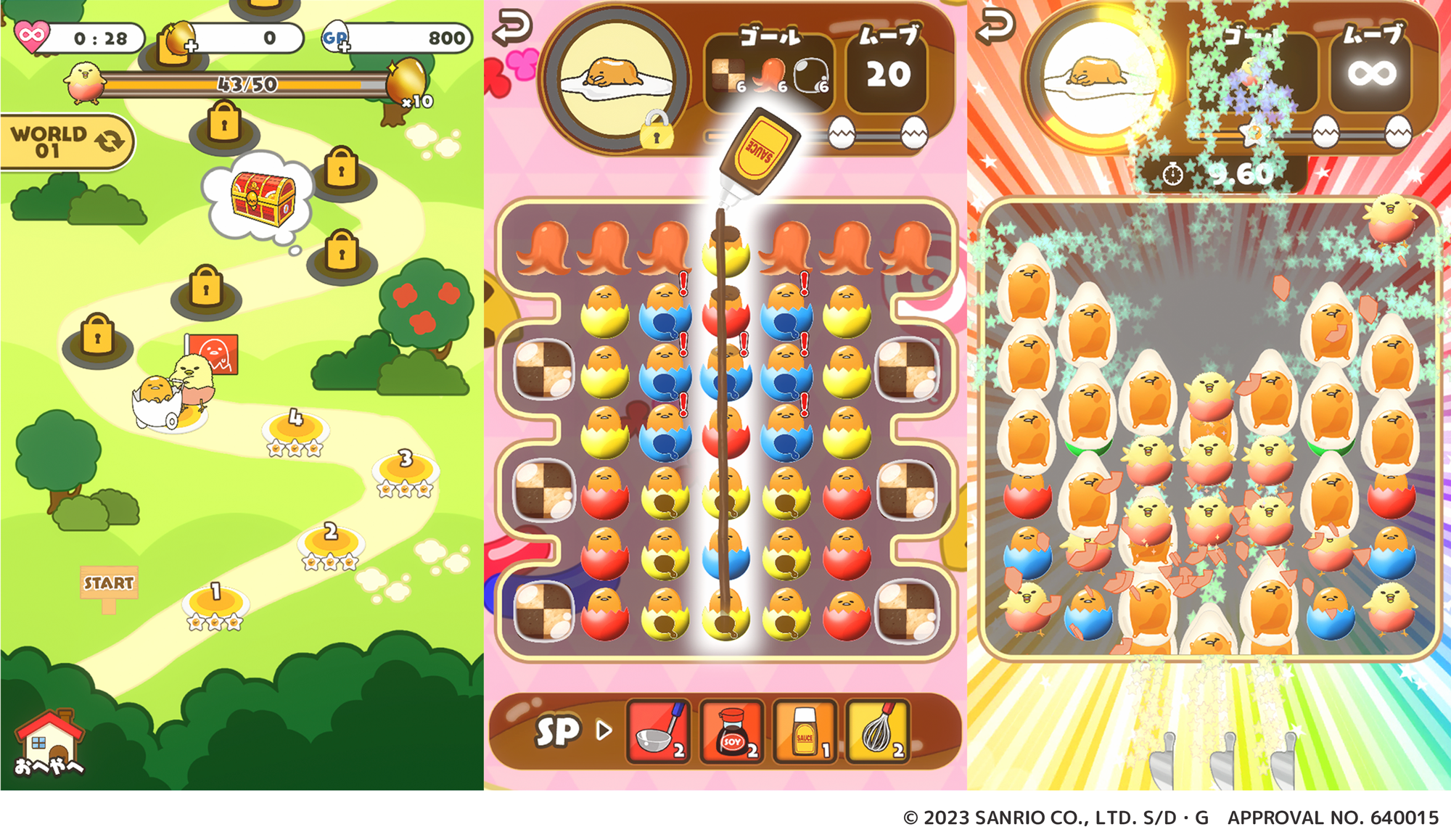 シリーズ累計500万ダウンロード以上の人気スマホゲームで、ゲーム内で入手できるレシピを使って調理を行い、1,000種類以上の様々な「ぐでたま」を集めていくというシリーズお馴染みの遊びはそのままに、最新作である本ゲームからは新たにパズルゲーム要素が追加されました。簡単操作で子供から大人まで誰でも気軽に遊べるゲームです。