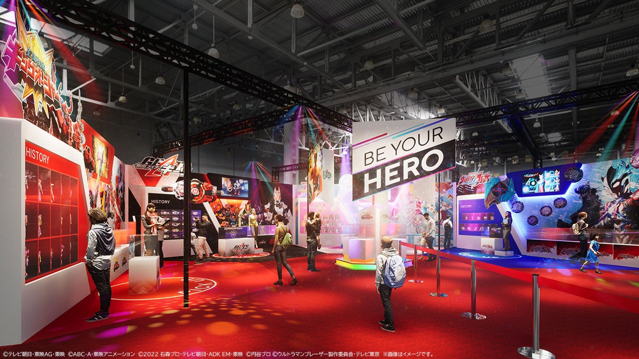 バンダイ・BANDAI SPIRITSブースのエントランスでは、「スーパー戦隊」「プリキュア」「仮面ライダー」「ウルトラマン」の4つの歴史あるシリーズから、最新ヒーローたちのキャラクター立像が、映像とともにお出迎えします。