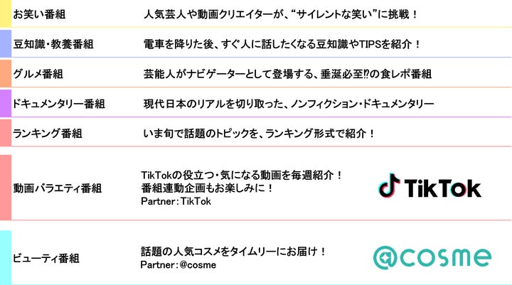 - 番組内容は「お笑い」「ドキュメンタリー」「豆知識教養」「グルメ」「コスメ」など多彩