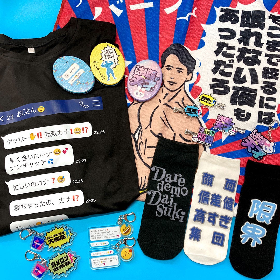 学生やZ世代に人気の「おじさん構文」を取り入れたTシャツやアクリルキーホルダーなど全21アイテムが登場します。