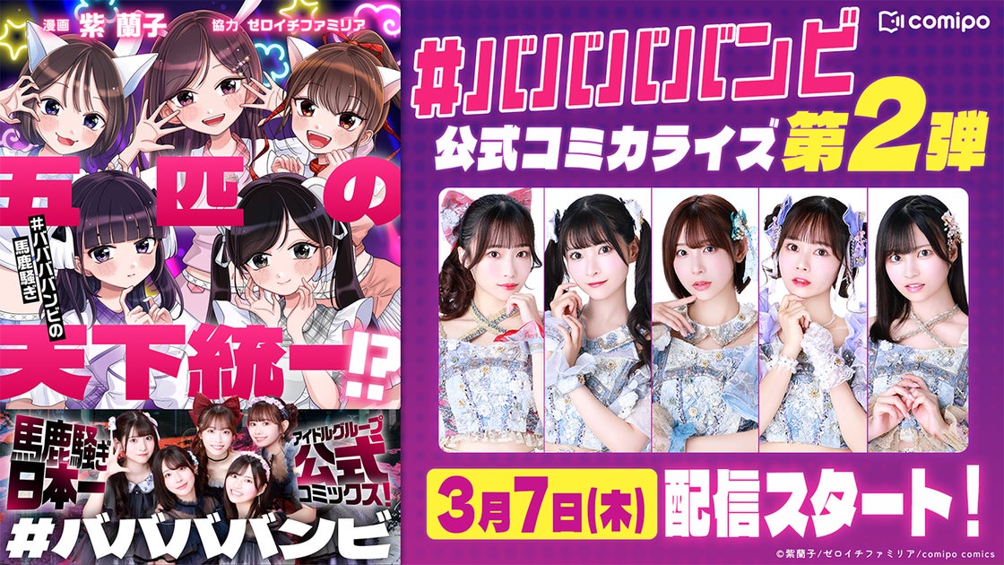 「comipo」アプリで読める『五匹の天下統一!?~#ババババンビの馬鹿騒ぎ~』は、2023年3月に武道館ライブを行う人気アイドルグループ#ババババンビの舞台裏を描いたコミカライズ作品です。