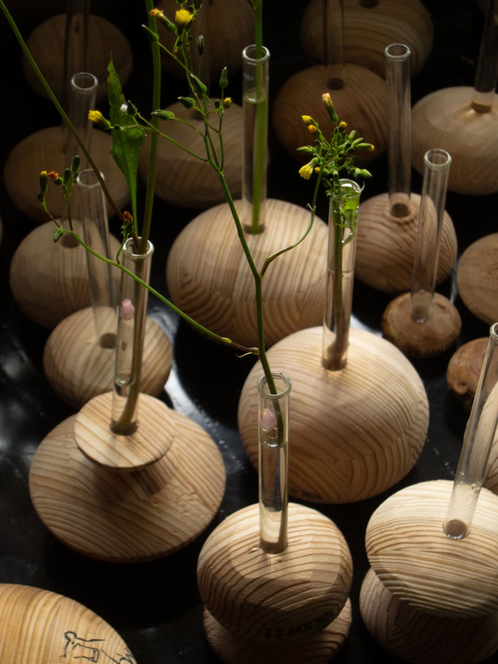 作品は「masaaki oyamada wild flower(風に揺れる)」で、試験管や杉、蜜蝋を使用し、雑草の花を活ける一輪挿しです。