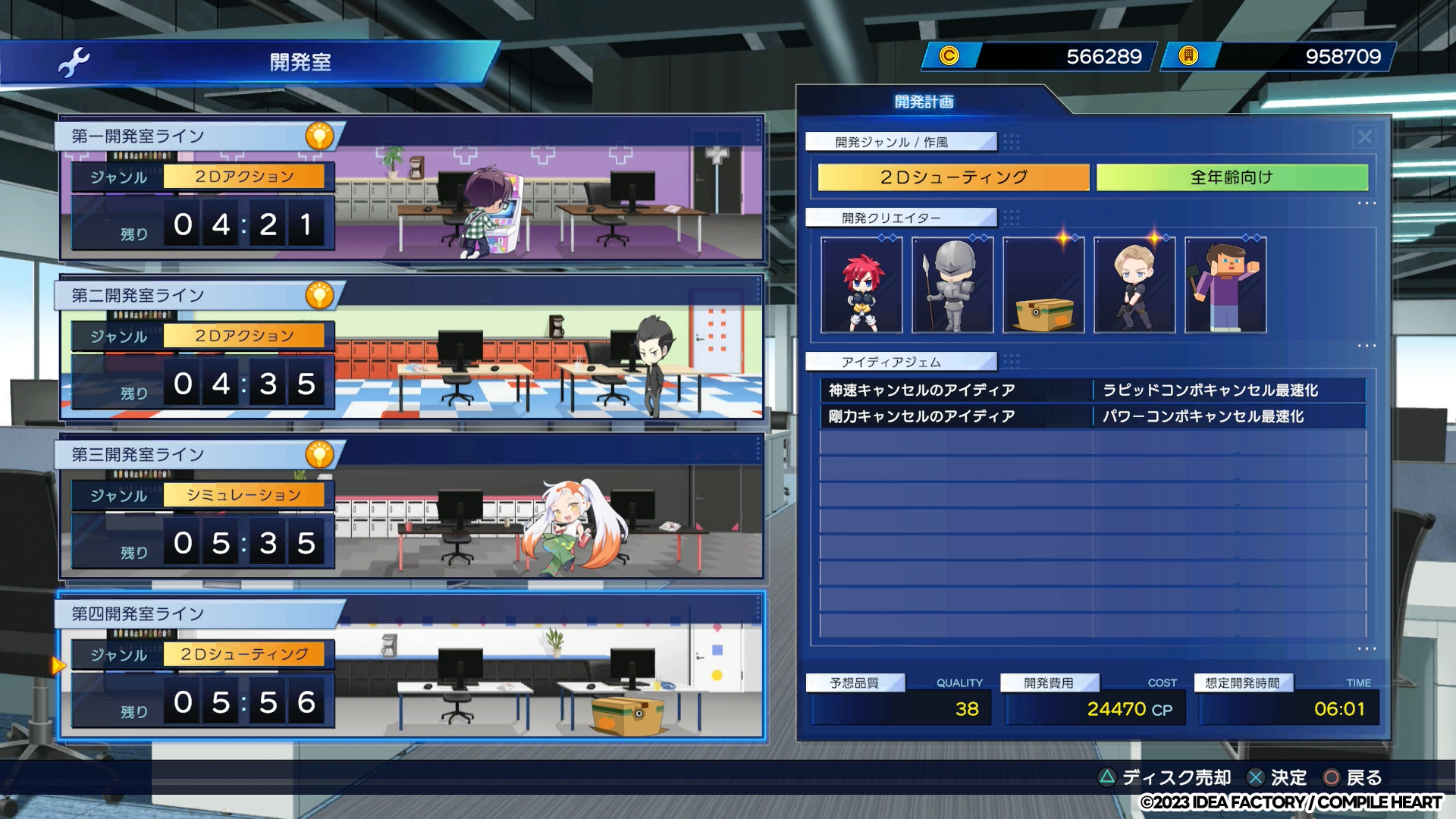 「ジャンル・作風」「クリエイター」「アイディアジェム」をかけ合わせて、独自のディスクを開発することが出来ます。ディスクを開発することで売上を獲得でき、また、完成したディスクはキャラクターが装備することもできます。