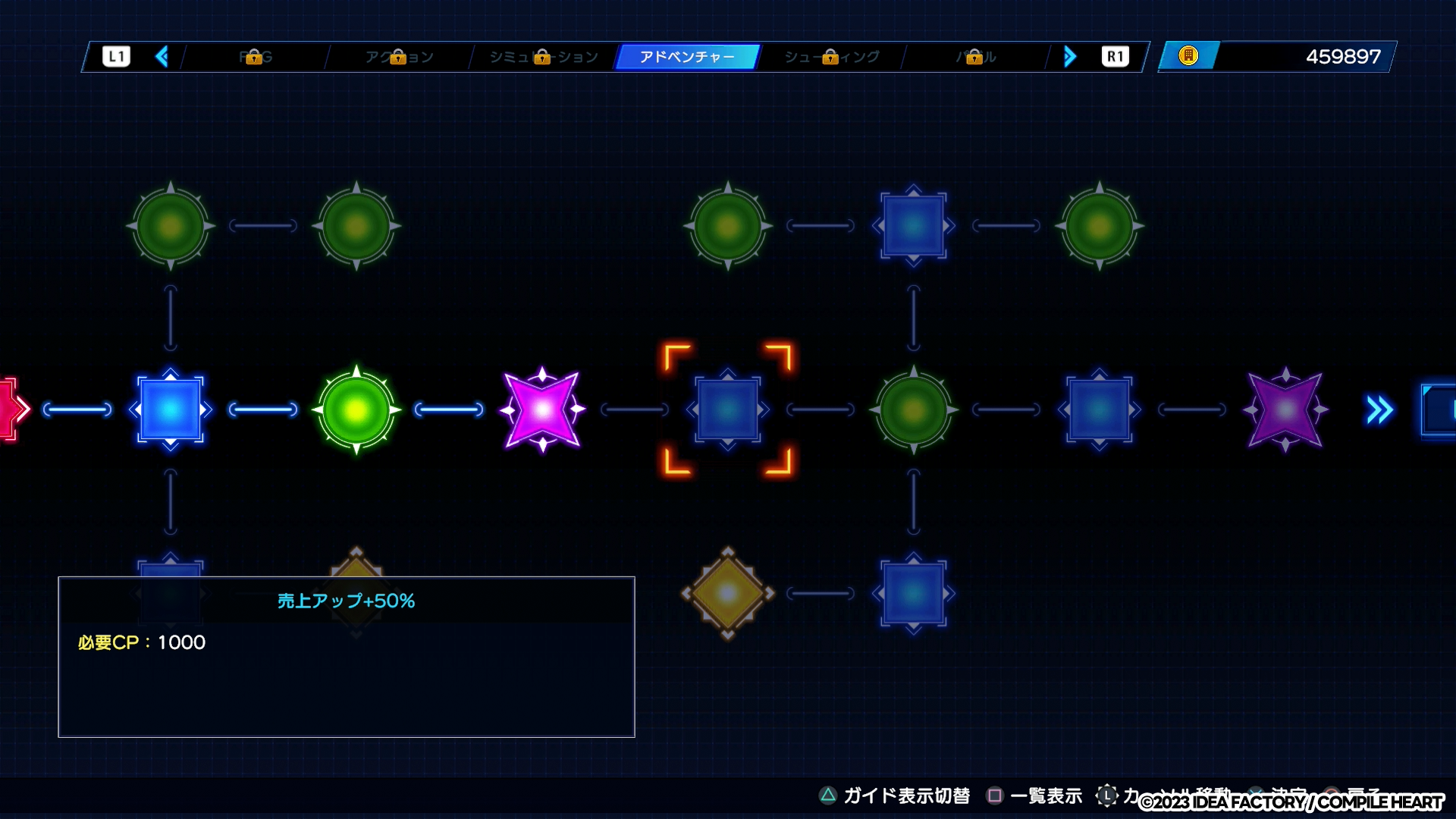 ディスク開発やダンジョン、イベント等で手に入るCP(カンパニーポイント)を使用してノードを解放することで、開発のノウハウやオブジェ、クリエイターを獲得することができます。