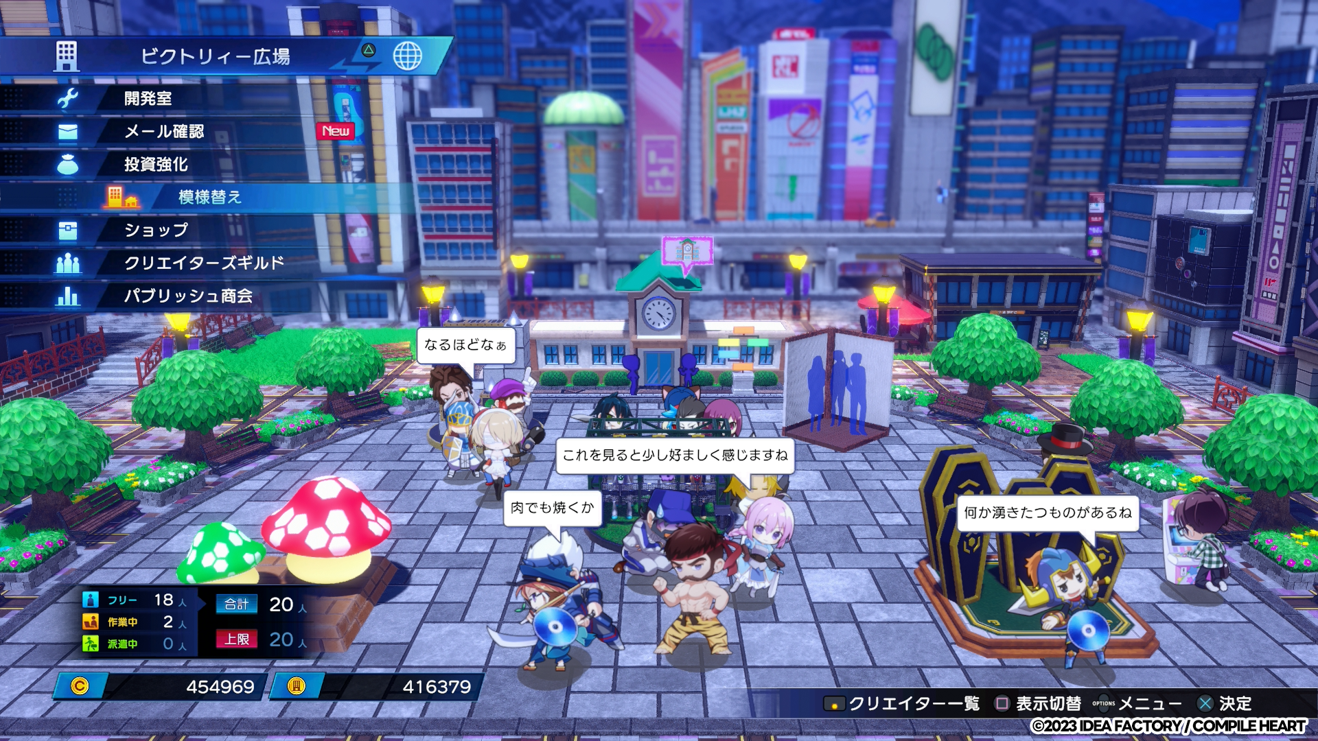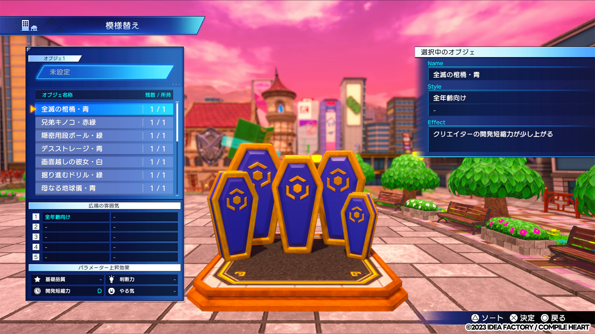 また、自社ビル前の広場に「オブジェ」を設置することもできます。広場を鮮やかに彩ることができ、更に所属するクリエイターの能力を向上させる効果も!