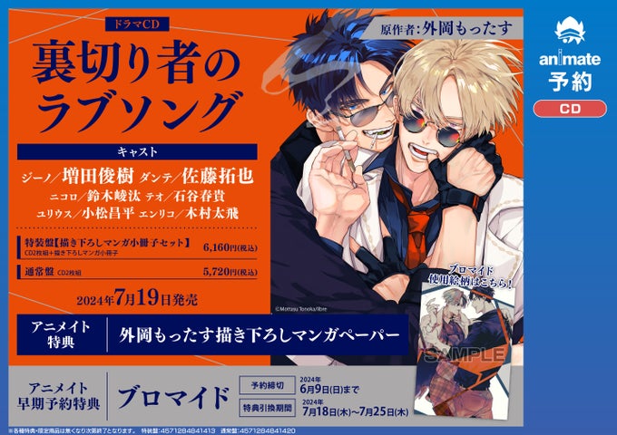 増田俊樹・佐藤拓也出演!マフィアBLドラマCD「裏切り者のラブソング」特典満載!予約開始&マンガ小冊子付き