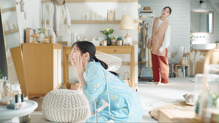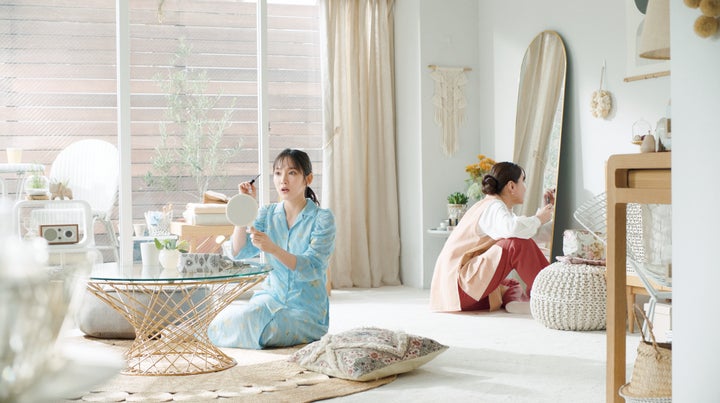 - 吉岡里帆さんがマスカラを使いながら友人と楽しむ様子描かれる