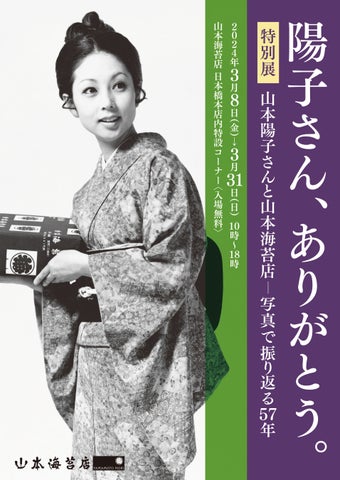 株式会社山本海苔店は、57年間にわたりイメージモデルを務めた山本陽子さんを偲んで、3月8日から31日まで日本橋本店で特別展を開催します。