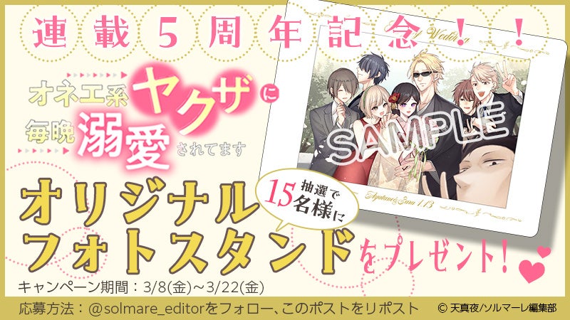 『オネエ系ヤクザに毎晩溺愛されてます』の連載5周年を記念して、オリジナルフォトスタンドプレゼントキャンペーンが開催中です。