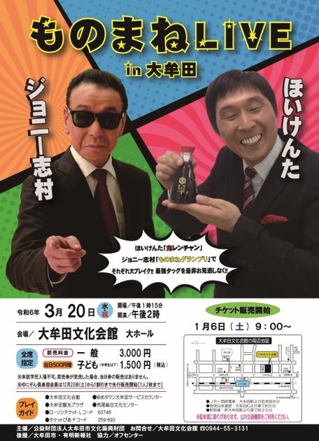 人気のお笑い芸人、ほいけんたさんとタモリさんのものまねで知られるジョニー志村さんが、令和6年3月20日に大牟田文化会館でコラボステージを披露します!チケットは一般3,000円、中学生以下1,500円で販売中。