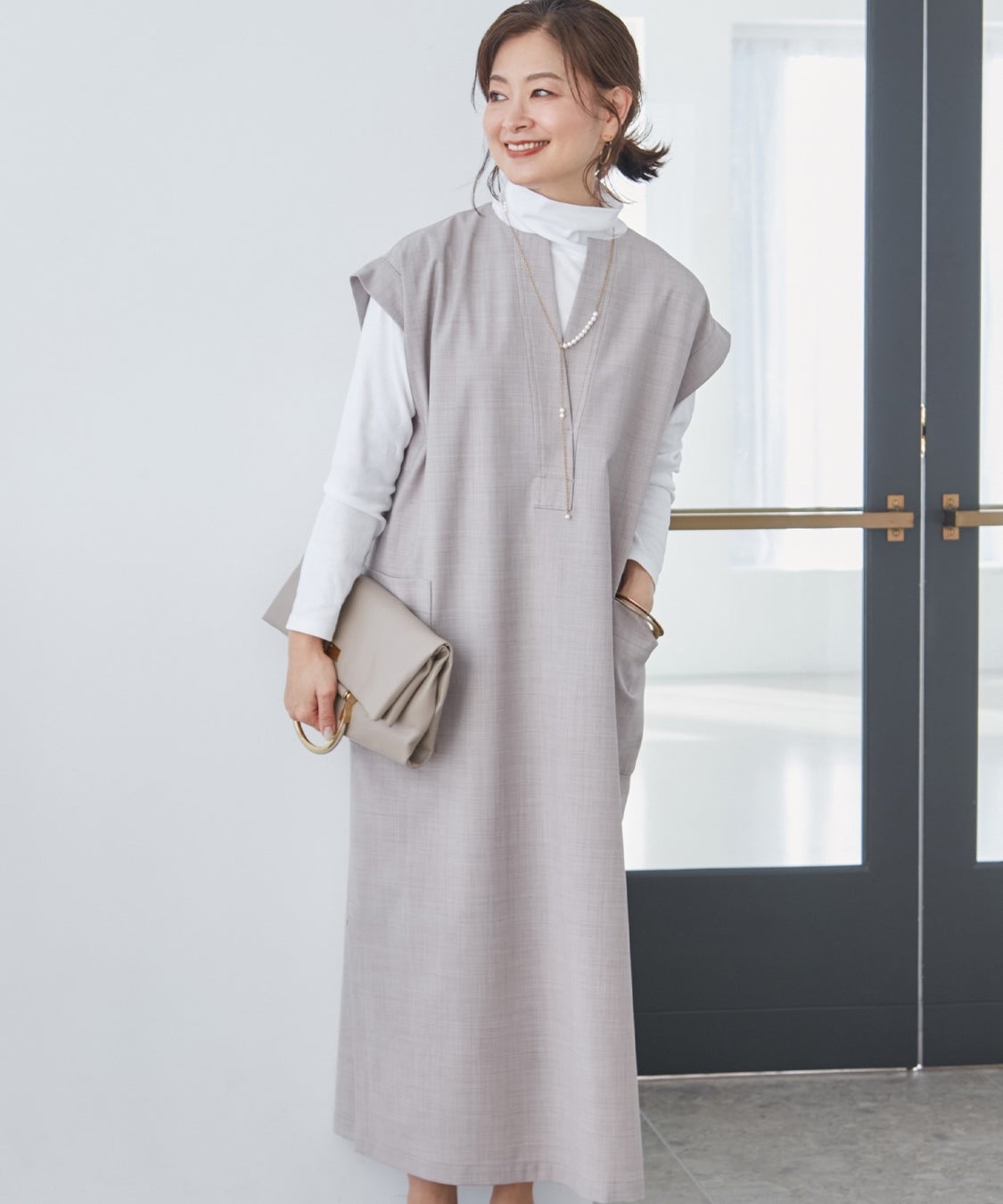 Aラインでモダンなシルエットを演出し、リネン調の素材がリッチな表情を醸し出しています。