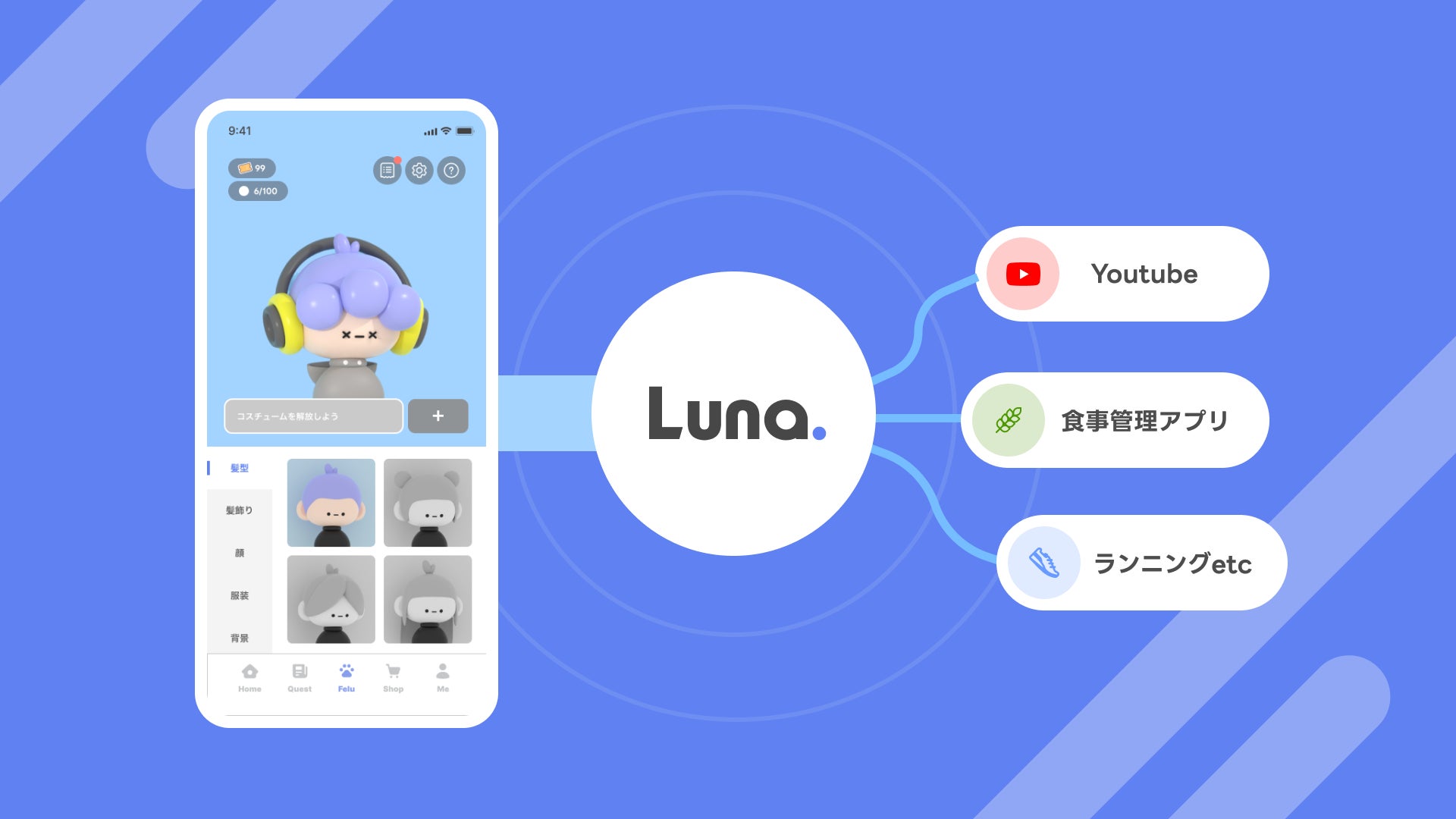 Lunaは健康習慣を楽しく続けられるアプリで、YouTubeのトレーニングや食事管理と連動し、ゲーミフィケーションを取り入れたサービスです。