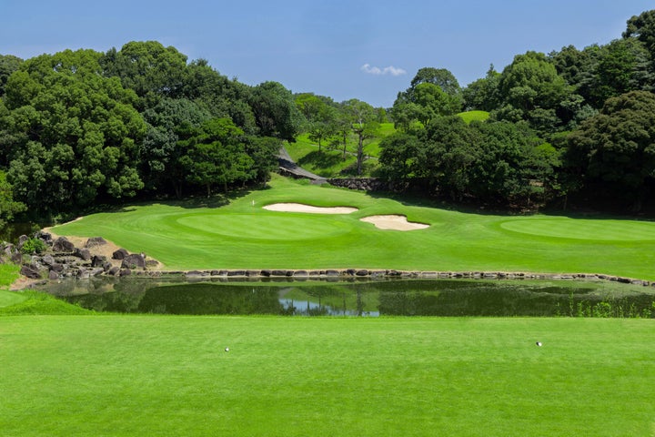 福岡県に位置する福岡レイクサイドカントリークラブは、戦略性の高い丘陵コースで、12ホールに大小さまざまな池が配置されています。