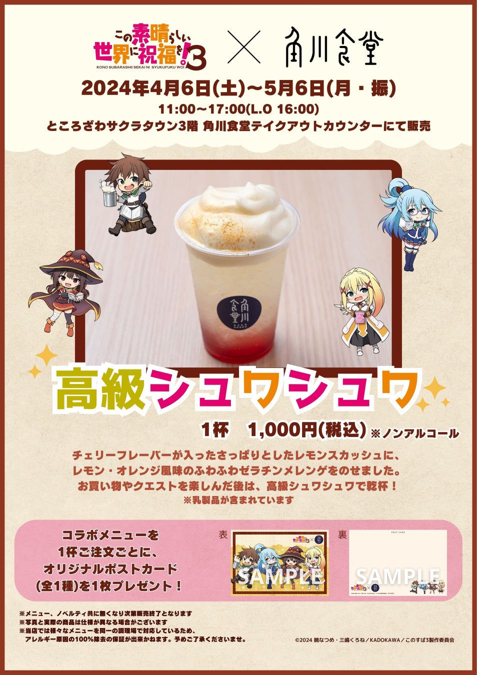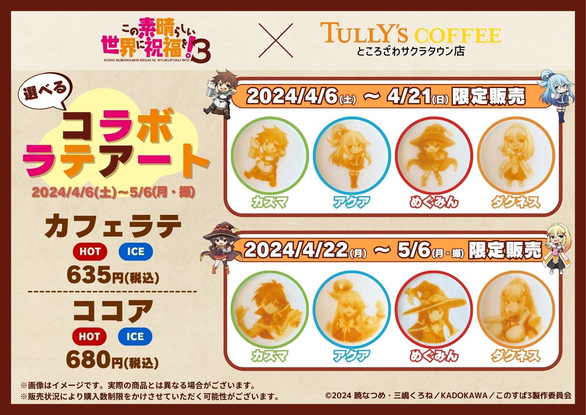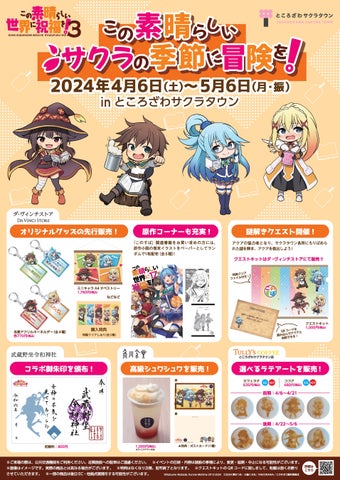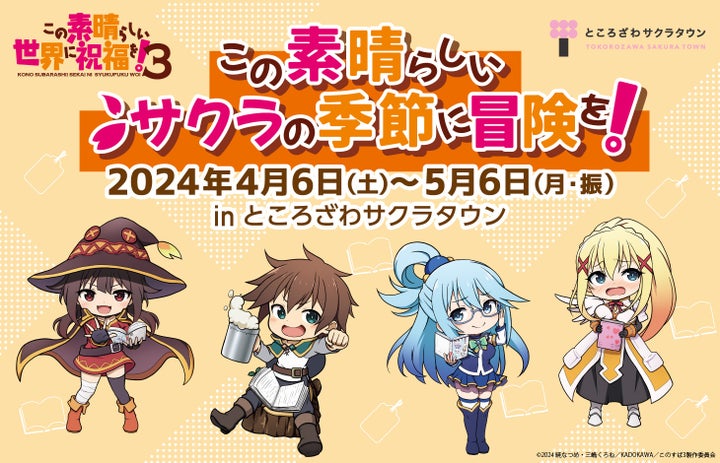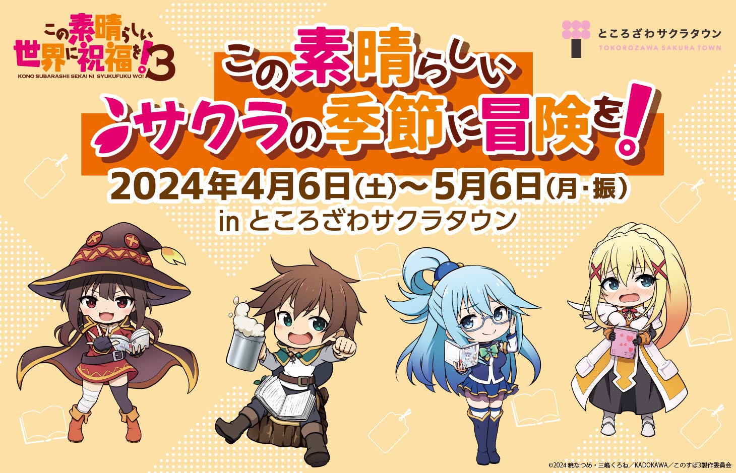 2024年4月6日から5月6日まで、埼玉県所沢市のところざわサクラタウンで開催されるTVアニメ「この素晴らしい世界に祝福を!3」周遊イベントは、ダ・ヴィンチストアでかわいらしいミニキャラグッズが登場し、税込2,000円ごとの購入で特典がもらえます。